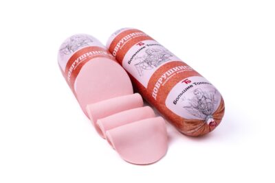 Состав: свинина, цыпленок-бройлер, вода питьевая, посол.-нитритная смесь, крахмал, сахар, загустители, краситель пищевой (кармин)